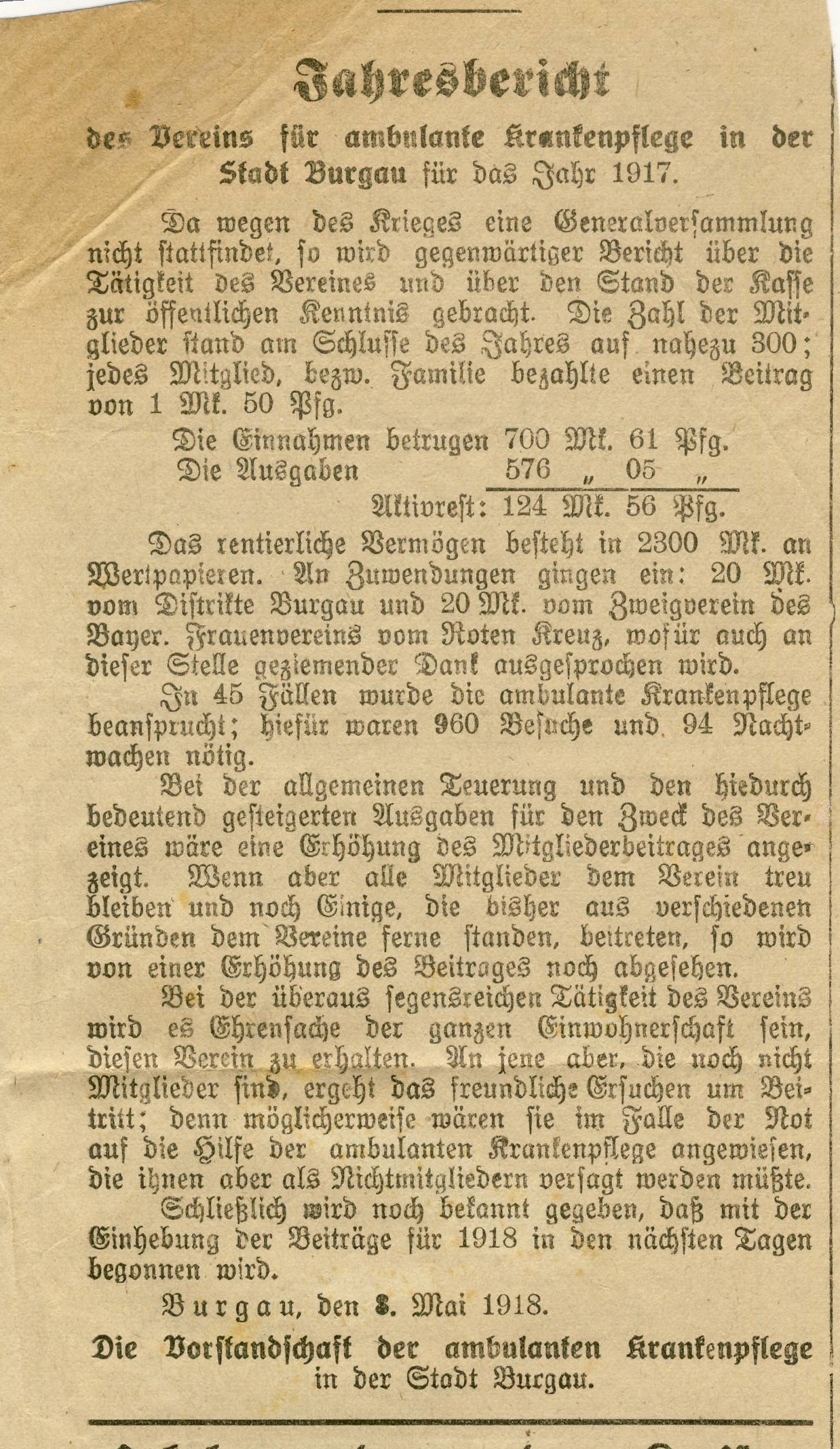 Wir fanden einen interessanten Artikel, bzw. eine Mitteilung des ambulanten Krankenpflegevereins, im Burgauer Anzeiger. Hier steht, dass es aufgrund des Krieges keine Generalversammlung geben kann und der Bericht über die Tätigkeit des Vereins im Jahre 1917 hier veröffentlicht wird. Es wird der Vermögensstand angegeben und dann die Einsätze des Vereins. Der ambulante Krankenpflegeverein wurde in 45 Fällen beansprucht mit 960 Besuchen und 94 Nachtwachen. Ferner wird aufgrund der allgemeinen Verteuerungen eine Mitgliederbeitragserhöhung angedacht.