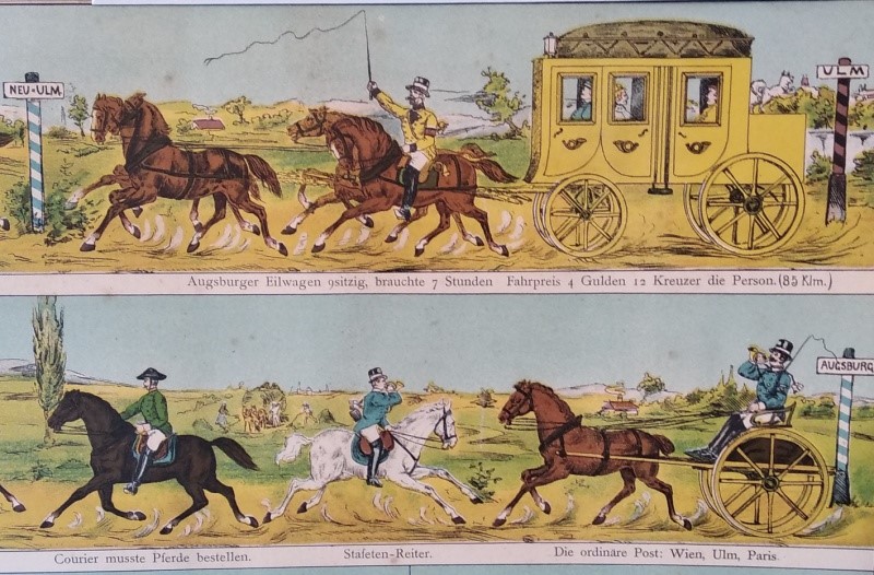 [3] Beschriftung auf koloriertem Kupferstich von 1850 mit Darstellung diverser Kutschen/Transportwagen von C. Scheiffele /Ulm, ehemaliger Thurn und Taxis- Postillion; siehe Bild, Kupferstich in Eigenbesitz. Die Fahrzeiten der Züge sind aus den Fahrzeiten Ulm -München herausgerechnet, aus: Geschichte der Planung und Inbetriebnahme des Ulmer Hauptbahnhofs ab 1850 bis 1866…, Teil II (über Google abrufbar).