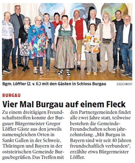 und sein Freund Thomas Brünner von der Volkstanz-Gruppe aus Österreich, dass sie genauso ein Burgau-Treffen, unabhängig von der großen Partnerschaft zwischen den beiden Burgaus aus Schwaben und der Steiermark, abhalten wollen. Der Termin wäre im Mai 2020 gewesen. Wie Sie alle liebe Leser*innen wissen, „spukte“ uns im wahrsten Sinne des Wortes Corona in unsere „Burgau-Suppe“. Die weiteren Details kann ich Ihnen ersparen, Covid hin oder her, Impfen hin oder her, im Dezember 2022 beschloss nun die Volkstanzgruppe mit Gerhard Seiler als Vorstand, egal ob nun auch das 40-jährige Partnerschaftstreffen mit den schwäbischen Burgauern im Jahr 2023 anstand, wir machen im Mai 2023 unser „Kleines Burgau-Treffen“ oder wie es nun heißt, unser „Internationales Burgautreffen“.