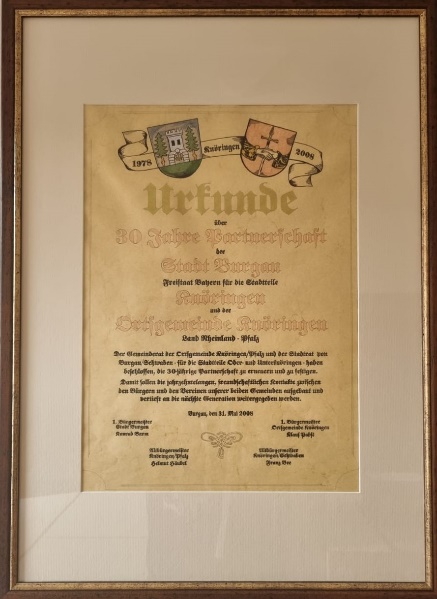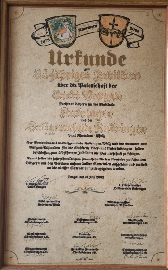 Auf der Urkunde zum 30igsten Jubiläum hatte für Oberknöringen/Burgau unser bereits verstorbener Bürgermeister Konrad Barm unterzeichnet