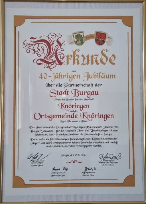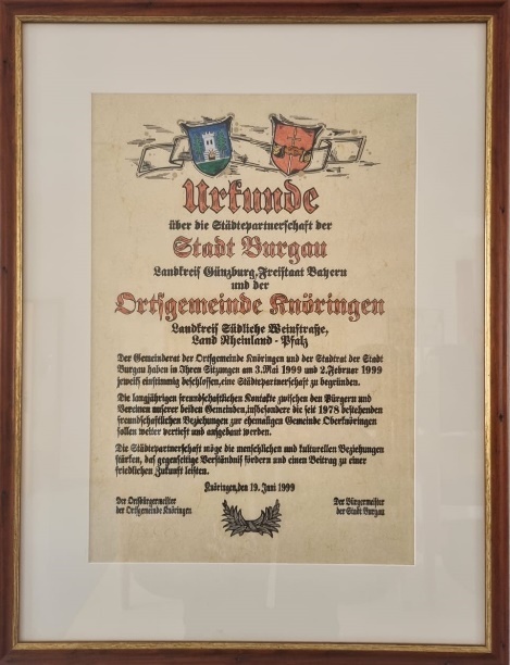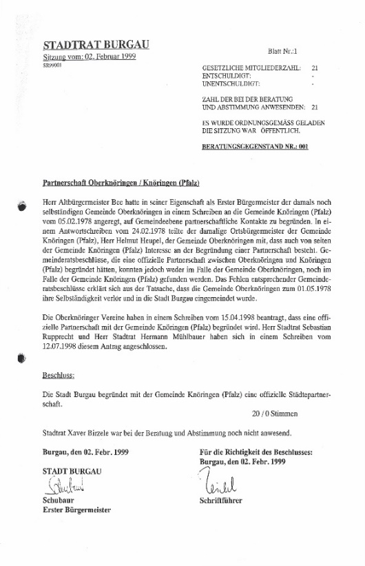 Diese Räte beschlossen aber auch vor der endgültigen Eingemeindung nach Burgau eine Partnerschaft mit Knöringen in der Pfalz einzugehen. Da die Eingemeindung aber ganz knapp vor der Tür stand, wurde kein protokollierter Beschluss mehr gefasst.