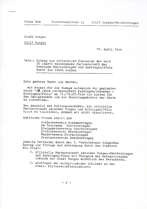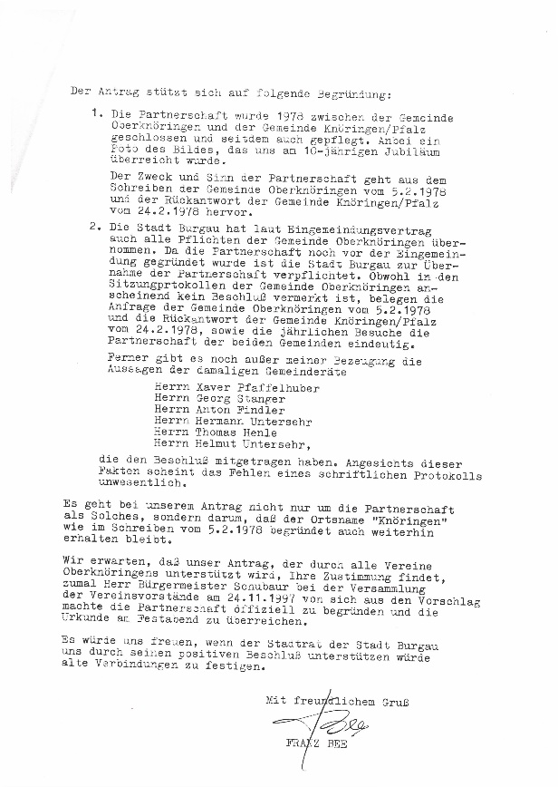 Es muss hier noch einmal darauf hingewiesen werden, dass diese Partnerschaft zwischen den Orten gleichen Namens, nämlich Knöringen, einzig und allein dem inzwischen verstorbenen Altbürgermeister Franz Bee zu verdanken ist. Bis zu einem Tode im Jahr 2019 engagierte er sich für den Erhalt der Partnerschaft. So war es auch Franz Bee, der im April 1998 an den damaligen Bürgermeister Wolfgang Schuhbaur und seinen Stadtrat einen zweiseitigen Brief schrieb und darum bat, endlich dem Wunsch der Oberknöringer Bürger zuzustimmen und die Partnerschaft mit Knöringen, an der südlichen Weinstraße in der Pfalz gelegen, als gleichberechtigte offizielle Partnerschaft, so wie mit Burgau in der Steiermark, anzuerkennen.