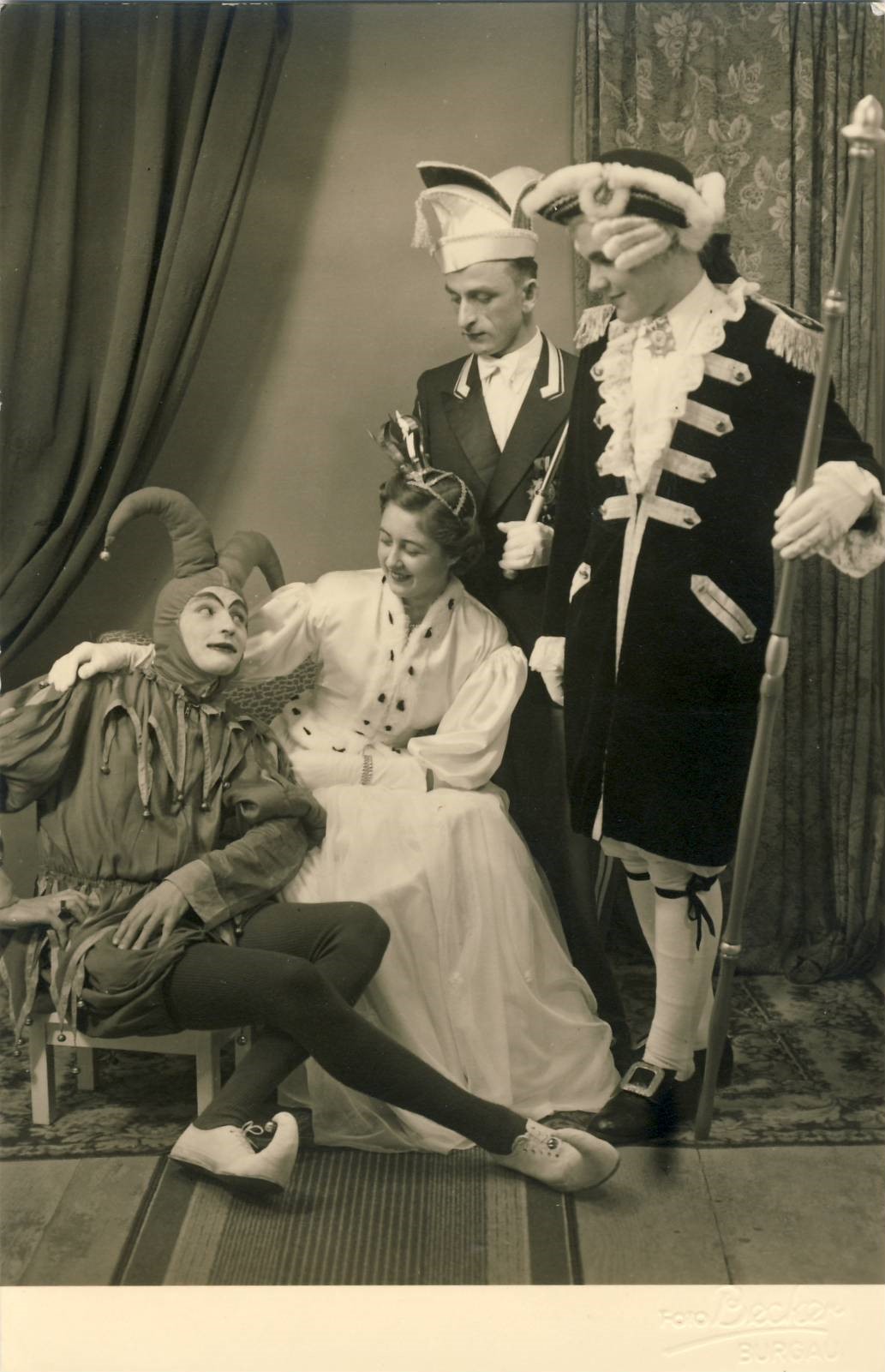 Präsident J.Kornprobst, Elferrat Karl Haugg sen., Ferdinand Kippenhahn als Hofmarschall, Karl Haugg jun. als Hofnarr und das Prinzenpaar Fanny I. und Paul I. - 1952