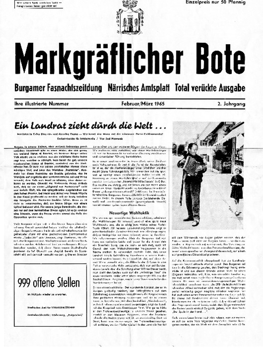Im letzten Jahr berichteten wir über die Fasnacht im Jahr 1964 in Burgau. Im Jahr 1964 erschien auch der erste Jahrgang des "Markgräflichen Boten", eine wunderbare und tolle Faschingszeitung.
