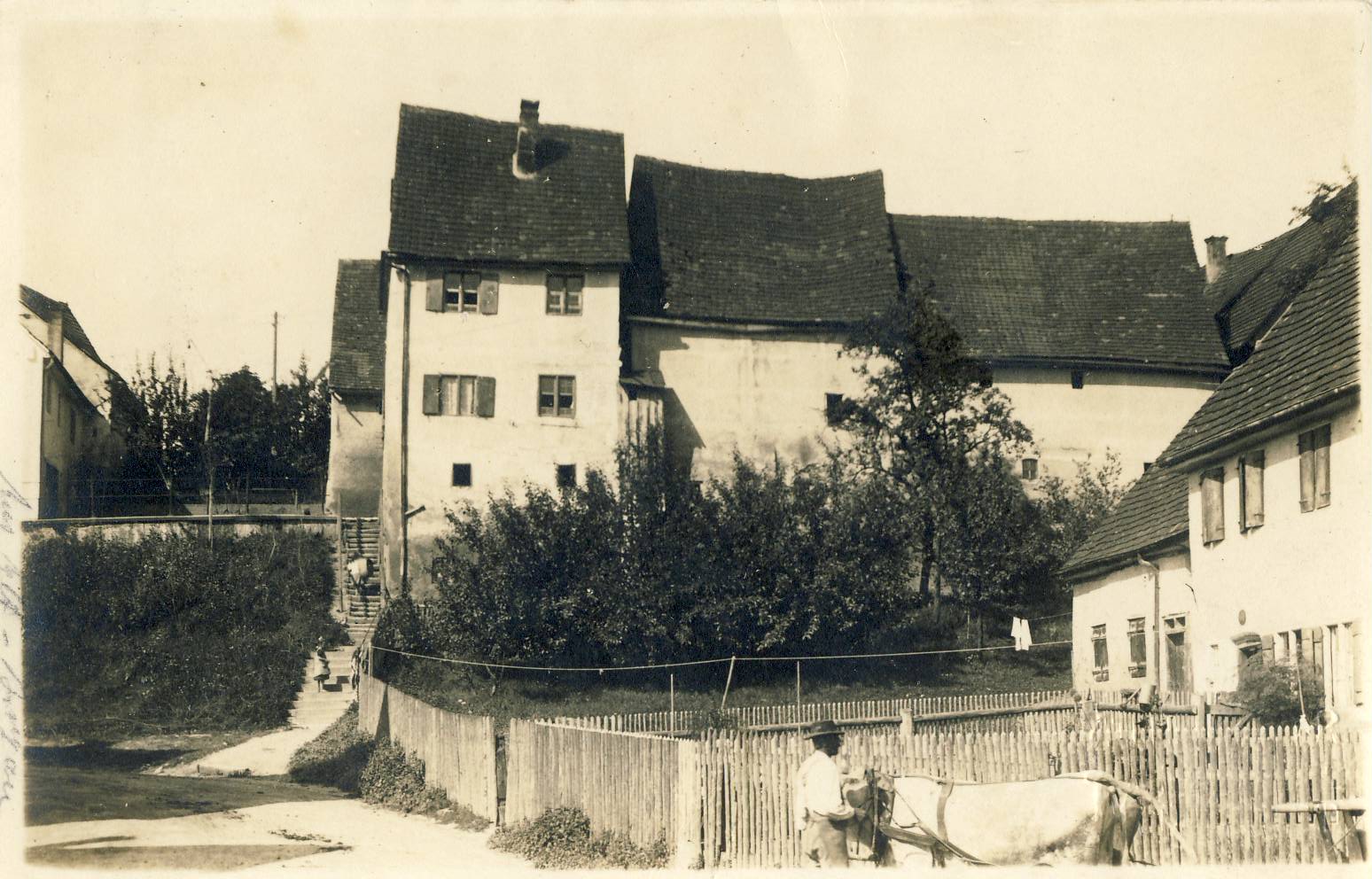 Und auf dem Parkplatz oder freien Platz standen bis zum Ende des Ersten Weltkriegs Stallungen, siehe untenstehendes Bild. Danach, bis in die 60iger Jahre des letzten Jahrhunderts, eine Heu- und Strohscheune der Familie Bronner.