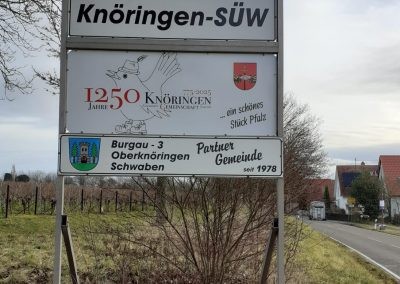 Dass diese wunderbare Winzergemeinde inmitten von Weinbergen umgeben sich vorstellen konnte mit der Gemeinde Oberknöringen im bayerischen Schwaben in Verbindung zu treten war für alle Seiten ein Glücksfall. Helmut Heupel, der damalige Ortsbürgermeister von Knöringen in der Pfalz und Franz Bee, Bürgermeister der damals noch selbständigen Gemeinde Oberknöringen, im Landkreis Günzburg und neben Burgau gelegen sind die „Hebammen“ dieser wunderbaren und bis heute lebendigen Partnerschaft. Ein Herzenswunsch von Franz Bee war, dass diese Partnerschaft auch nach der Eingemeindung nach Burgau im Jahr 1978, durch einen Stadtratsbeschluss ratifiziert wird. Dies wurde dann 1998 endlich vollzogen und die ersten „zarten Bande“, im Frühjahr 1978 geknüpft, galten als Beginn der Partnerschaft Oberknöringen -Knöringen-Pfalz!