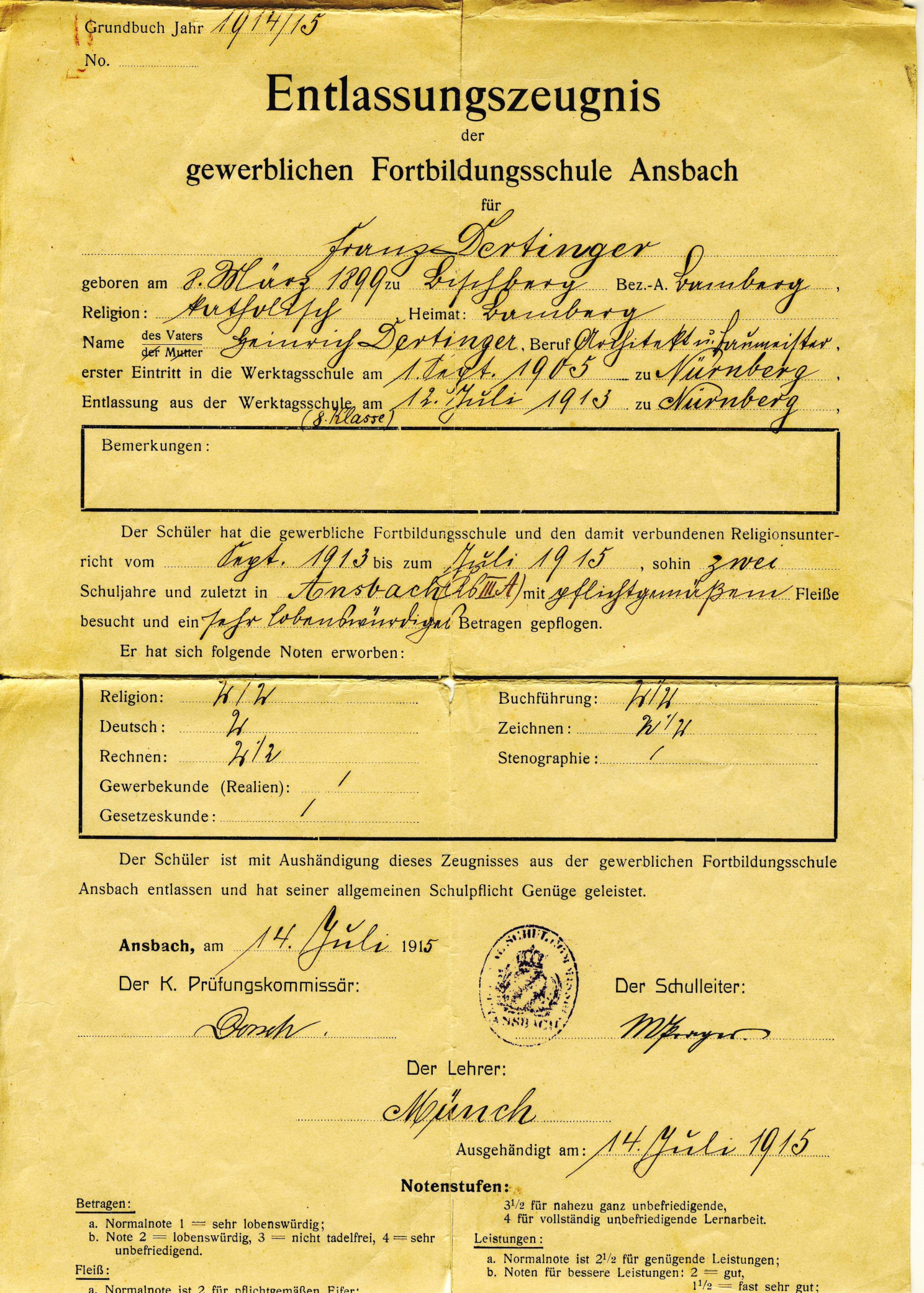 Entlassungszeugnis der gewerblichen Fortbildungsschule in Ansbach
