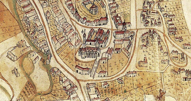 Ausschnitt aus einem Stadtplan von 1766, auf dem gut zu erkennen ist die enge, dichte Bebauung des Kirchplatzes